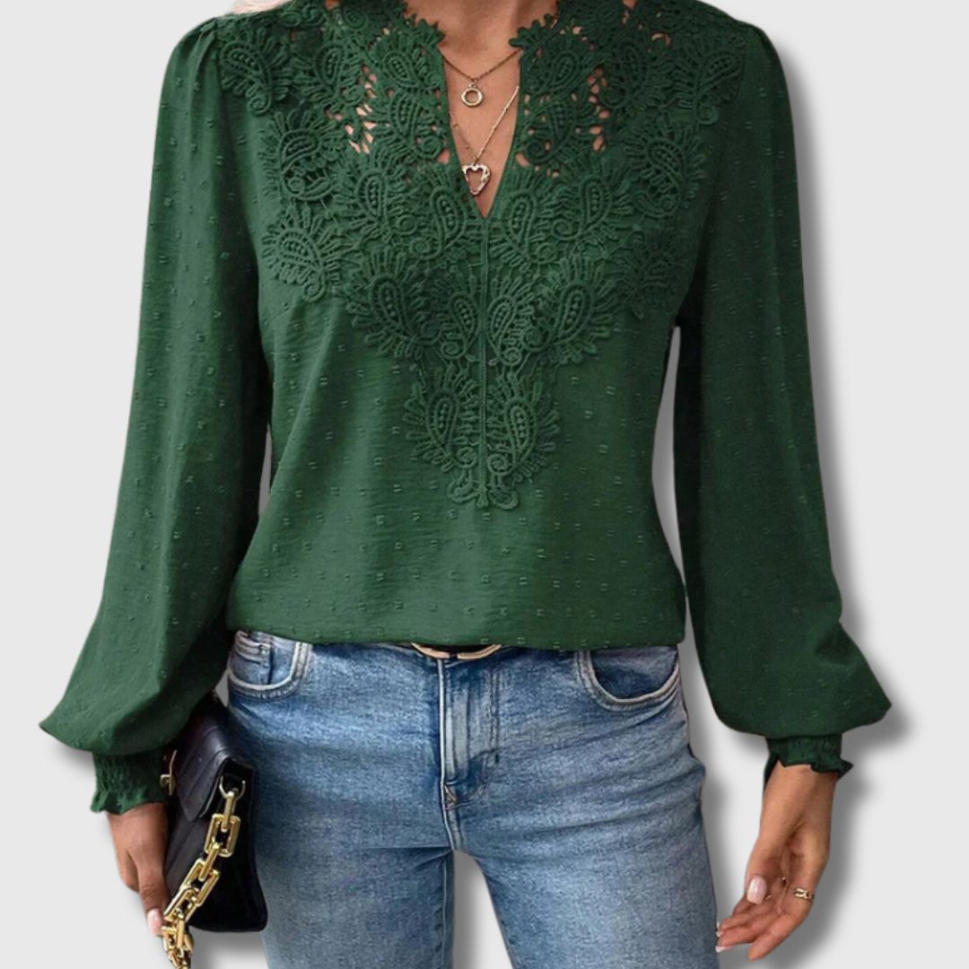Elegante Spitzenbluse mit V-Ausschnitt vereint Stil und Komfort. Die feine Spitze verleiht eine feminine Ausstrahlung, und 100 % Baumwolle sorgt für ein angenehmes Tragegefühl.